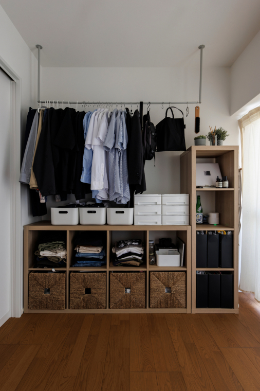 築30年以上の中古マンションを、ご夫婦のライフスタイルに合わせてリノベーションしました。 ご夫婦お二人ともがお料理好きということもあり、暮らしの中心にキッチンを配置しました。アイランドカウンターを設け、料理をしながら家族や友人と自然に会話が生まれる空間にしています。 また、奥様の「洋服も楽しみたい」という希望から、ショーケースのような収納を設置。お気に入りの服を魅せながら収納でき、リビングでくつろいだり、お料理を楽しみながらでもお洋服を眺めることができます。既存壁を活かしながら、壁を減らして広くつなげたリビングは、家のどこにいても家族の気配を感じられる開放的な空間に。必要な場所にはしっかり収納を配置し、すっきりと快適に暮らせる工夫も取り入れています。